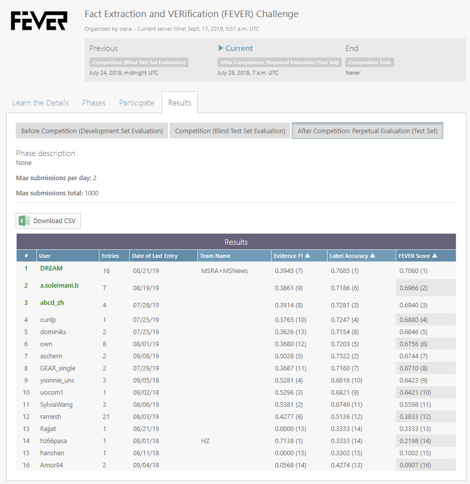 该评测任务在 Codalab 有一个官方的排行榜,测试集的标注信息不对外开放,所以各参评者需要提交各自的系统到官方平台进行比较。目前,我们的系统 DREAM 在两项评测指标中均取得了目前 state-of-the-art 的结果。