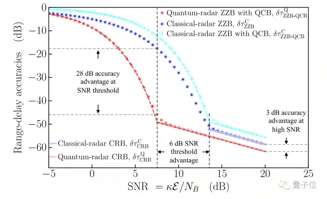 两者的对比可以直观得从下图中看出,其中横轴代表信噪比,纵轴代表均方距离延迟精度(越低越好),红线为量子雷达的表现:
