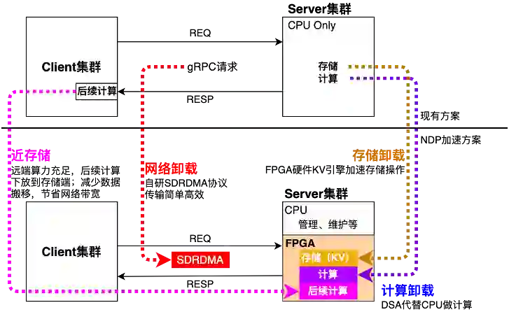 网络方面,LaoFe NDP 架构将 CPU 收发网络数据操作,卸载到 FPGA 上。Client 发送的请求包直接发送给 FPGA。相比 gRPC 基于 TCP/IP,功能过于复杂,性能和延时方案无法保证。而使用基于 FPGA 实现了一套 SD-RDMA 协议,通过应用层添加字段的方式,保证了类似 gRPC 的可靠性传输,这大大降低了请求时延。