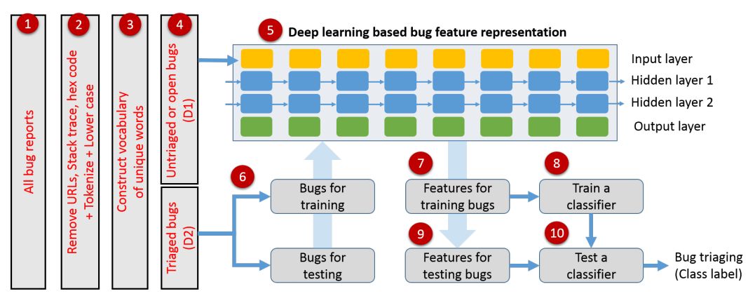 该方法和传统的自动归类 bug 通道不同,(i) 步骤 4 中,考虑了未归类的 bug(D1)(在传统方法中完全被忽略),(ii) 基于深度学习的 bug 报告表征取代了 BOW 表征。步骤 4 和 5 的添加,使得可以自动从数据本身而不是通过手工工程学习 bug 报告表征。