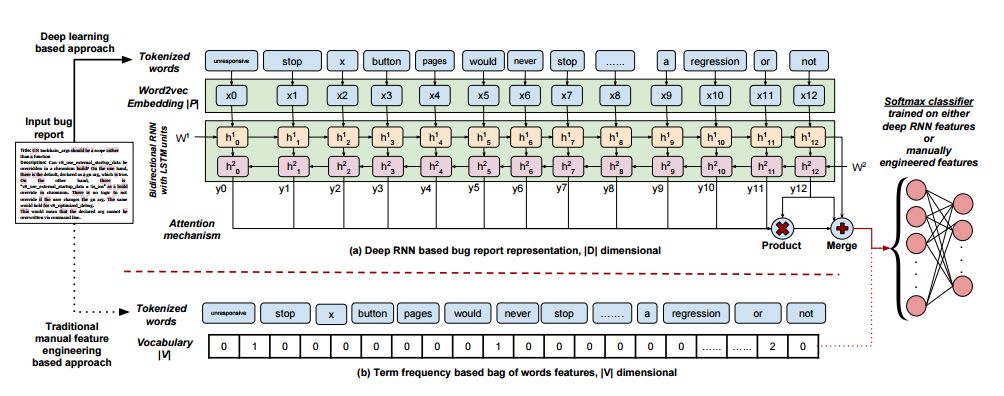 提出了一种使用 DBRNN-A(基于注意力和 LSTM 单元的深度双向循环神经网络)的新型的 bug 报告表征方法。作者提出的深度学习算法可以在长文本中「记住」其中的语境。