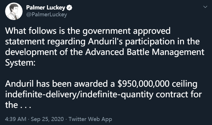 9 月 25 日,Palmer Luckey 在推特上宣布,Anduril 已成为美国空军先进作战管理系统(ABMS)的供应商之一。其他供应商还包括 AWS 以及 16 家鲜为人知的公司。