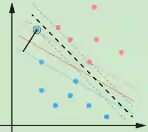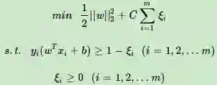 SVM对训练集里面的每个样本(xi,yi)引入了一个松弛变量ξi≥0,使函数间隔加上松弛变量大于等于1,也就是说: