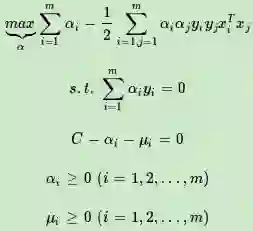 这就是软间隔最大化时的线性可分SVM的优化目标形式,和上一篇的硬间隔最大化的线性可分SVM相比,我们仅仅是多了一个约束条件0≤αi≤C。我们依然可以通过SMO算法来求上式极小化时对应的α向量就可以求出和w和b。
