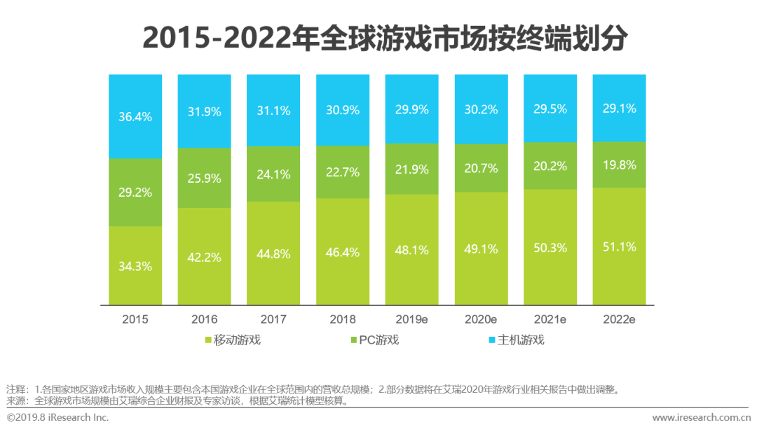 其中,移动游戏、PC游戏及主机游戏分别占据市场总份额的46.4%、22.7%与30.9%。
