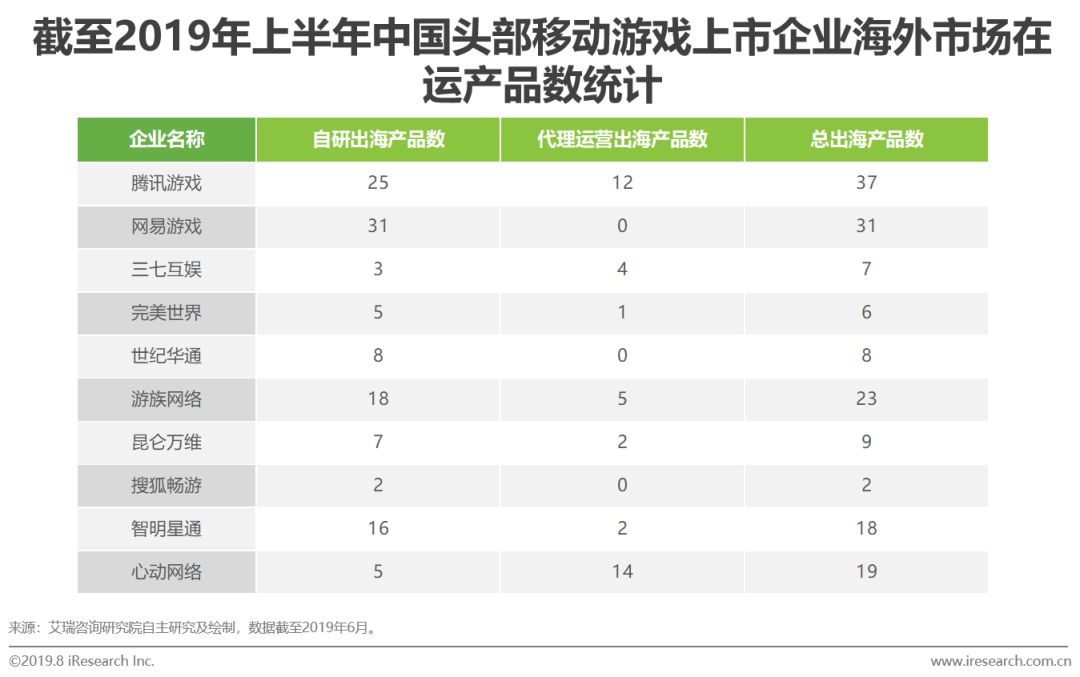 2018年起,在市场背景的推动下,我国头部移动游戏企业纷纷开始布局海外。下表中统计了截至2019年6月,我国头部移动游戏上市企业在海外应用商店(除中国大陆及港澳地区)仍在运营的产品总款数。