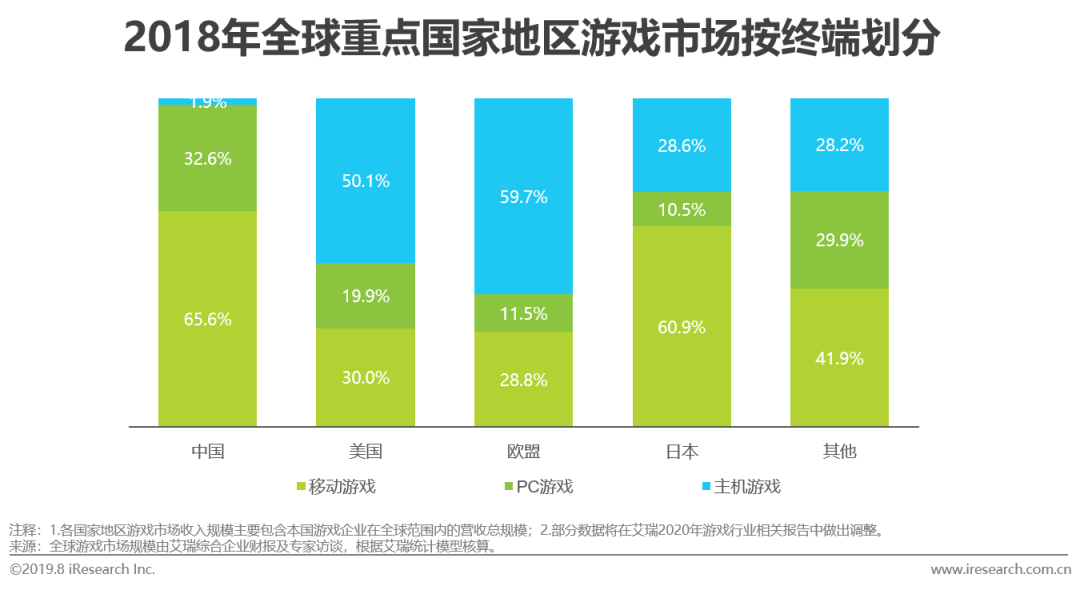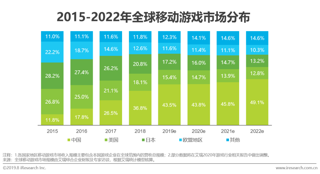 而在美国及欧盟地区,移动游戏市场的行业总占比尚不足30%。