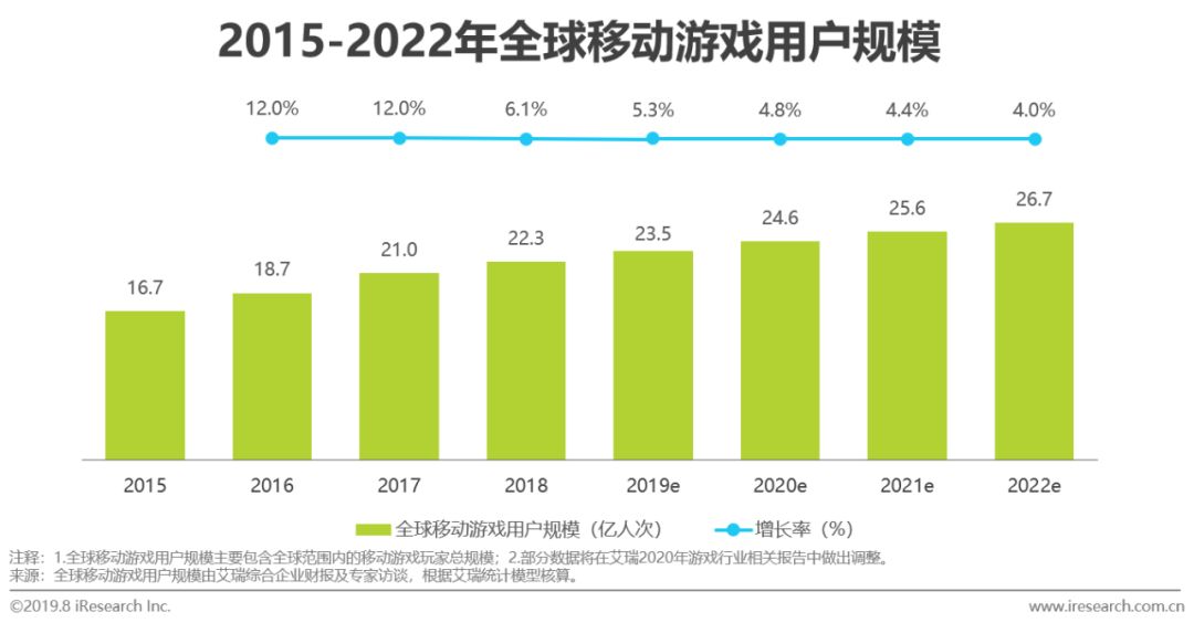 2018年全球移动游戏用户规模达22.3亿人次,同比增长6.1%,用户市场整体增速相较往年有所下降。