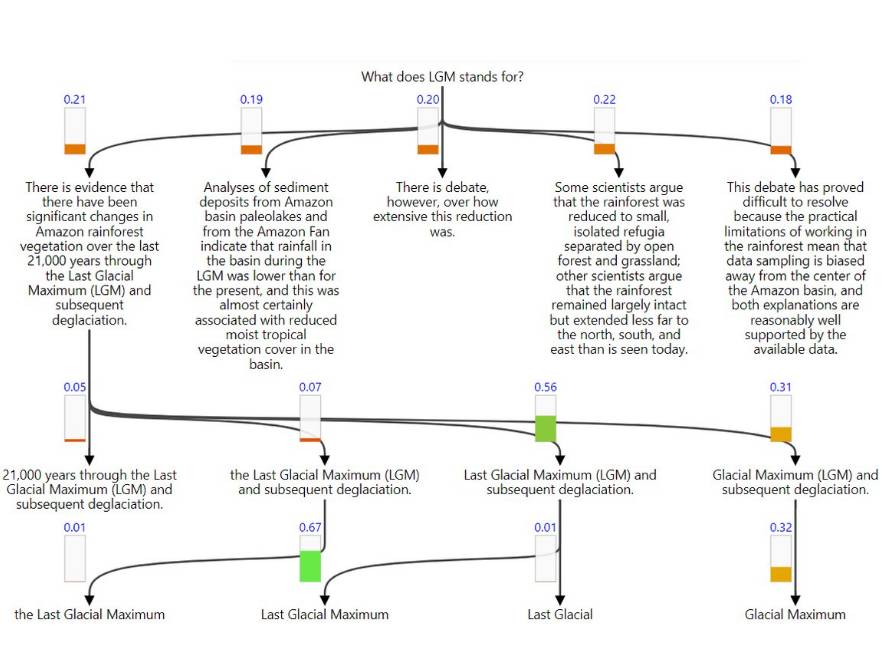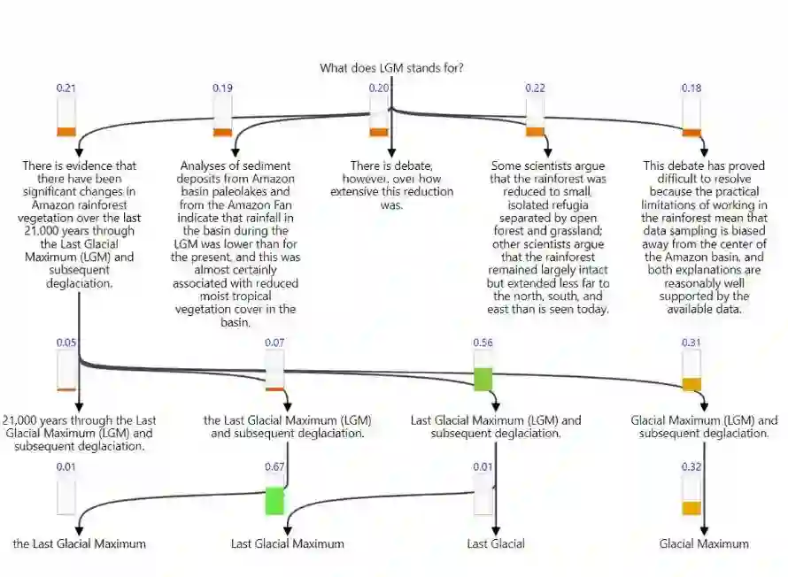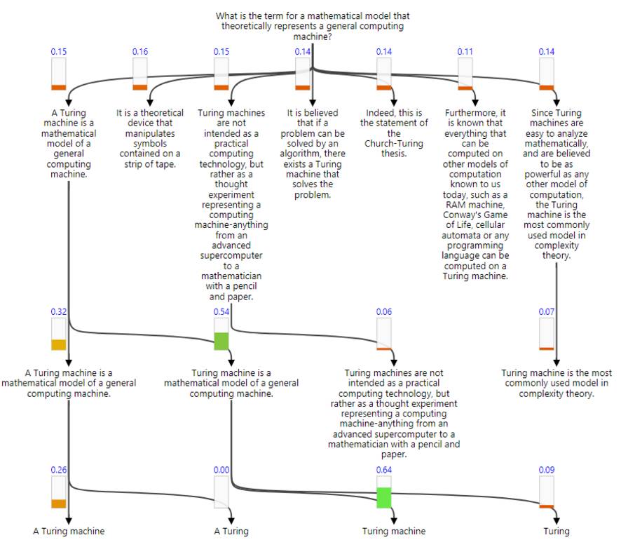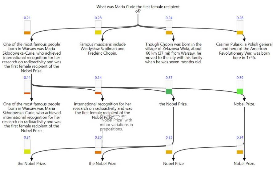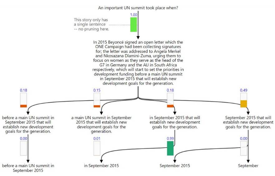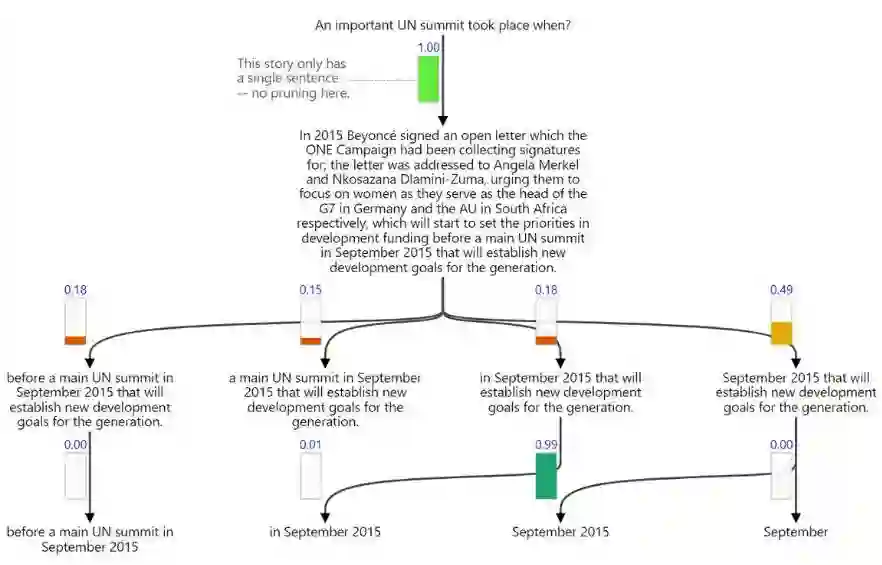 文中不是每一部分都和问题相关,所以我们需要在早期先探测答案可能出现的地方。GNR 将这种直觉翻译为逐渐选取文档的各个子部分。下方展示了这个过程,其中垂直条形表示决策概率,并用盘桓的节点强调文档中正被考虑的部分。