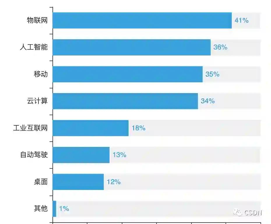而对于操作系统的发展方向,参与问卷调查的开发者看法各有不同,41%的开发者更加看好物联网方向,看好人工智能、移动、云计算发展方向的开发者各占36%、35%、34%。