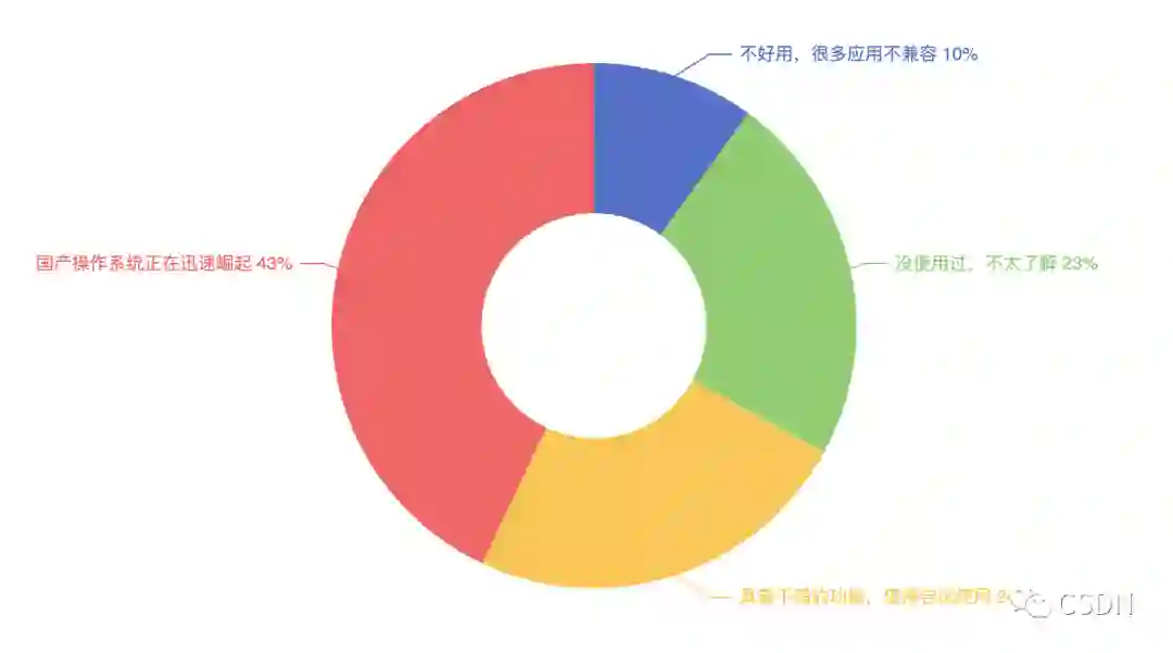 从调查数据看,开发者对国产操作系统的发展热切关注。43%的开发者表示国产操作系统正迅速崛起,24%的开发者认可国产操作系统,称其具备不错的功能,值得尝试使用。