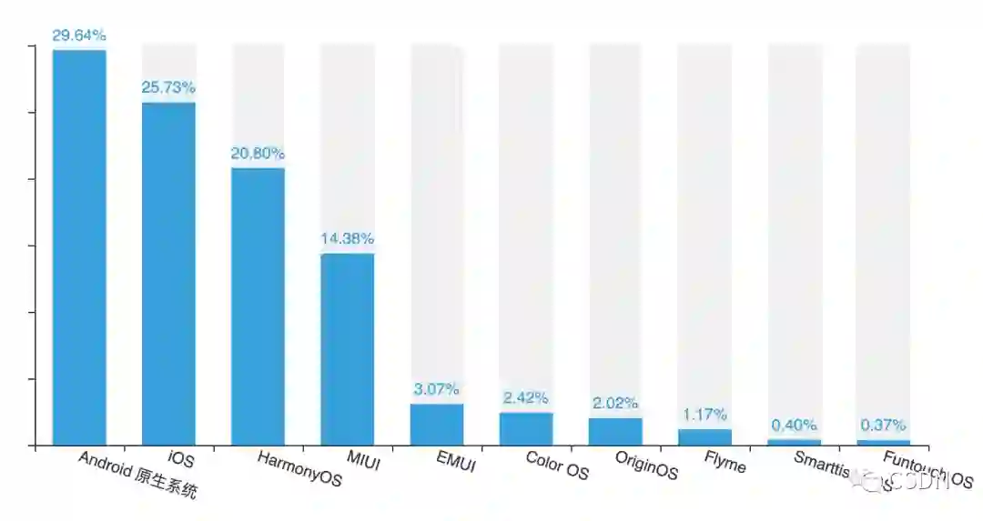 移动互联网时代,移动操作系统也是开发者每天都会用到的。Android原生系统依然排在第一,iOS紧随其后,HarmonyOS进步神速,位列第三。
