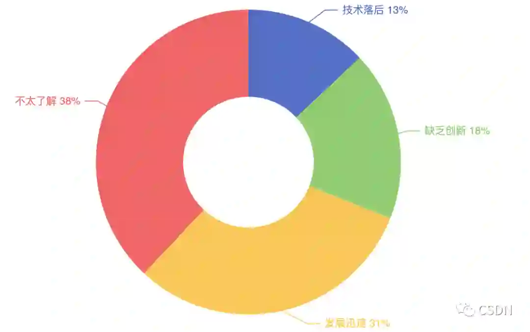 国产数据库近年的迅速发展,为众多开发者留下了深刻的印象,占比31%,另有31%的开发者认为国产数据库缺乏创新(18%)、技术落后(13%)。