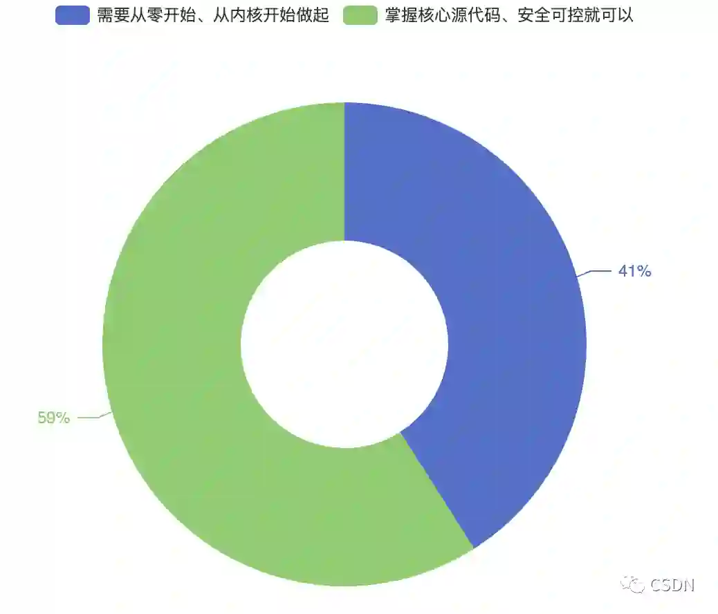 而对于什么是自主研发的国产操作系统,在开发者之间产生了较大分歧。59%的开发者认为,只需要掌握核心代码、安全可控的操作系统就是国产操作系统,另一部分开发者则表示要从内核研发开始做起。