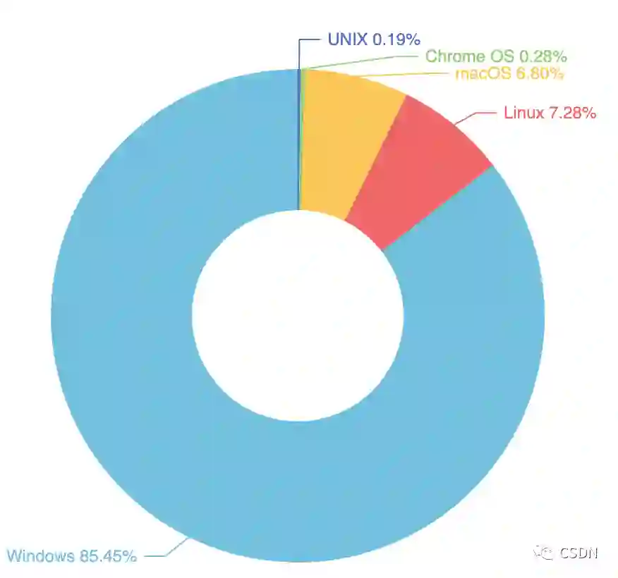 在众多桌面操作系统中,Windows依然是大部分开发者常用的桌面操作系统,占比85.45%。