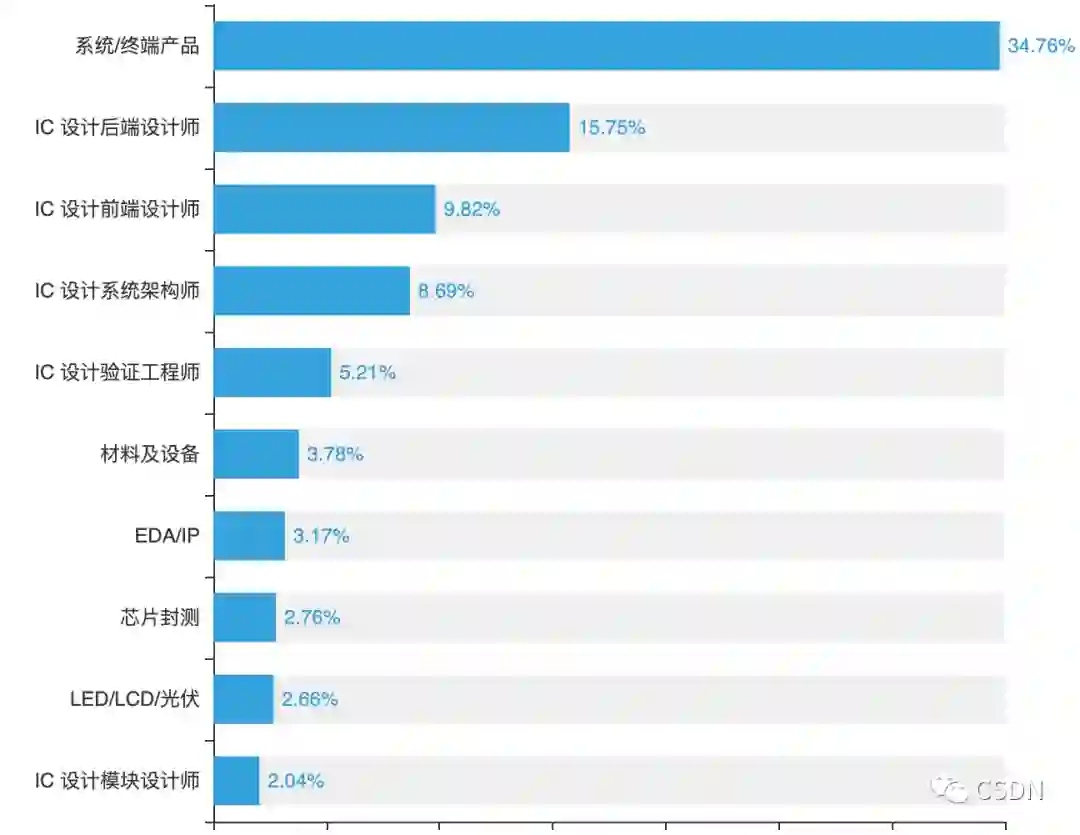 尽管有关芯片开发的岗位众多,其中在系统/终端产品方向的开发者最多,占比34.76%,其次是占比15.75%的IC设计后端设计师。但国内核心高端芯片人才的极度匮乏已经成为行业发展的重要瓶颈。62.69%的受访者认为国内最稀缺的是芯片架构师,这是符合现状的。