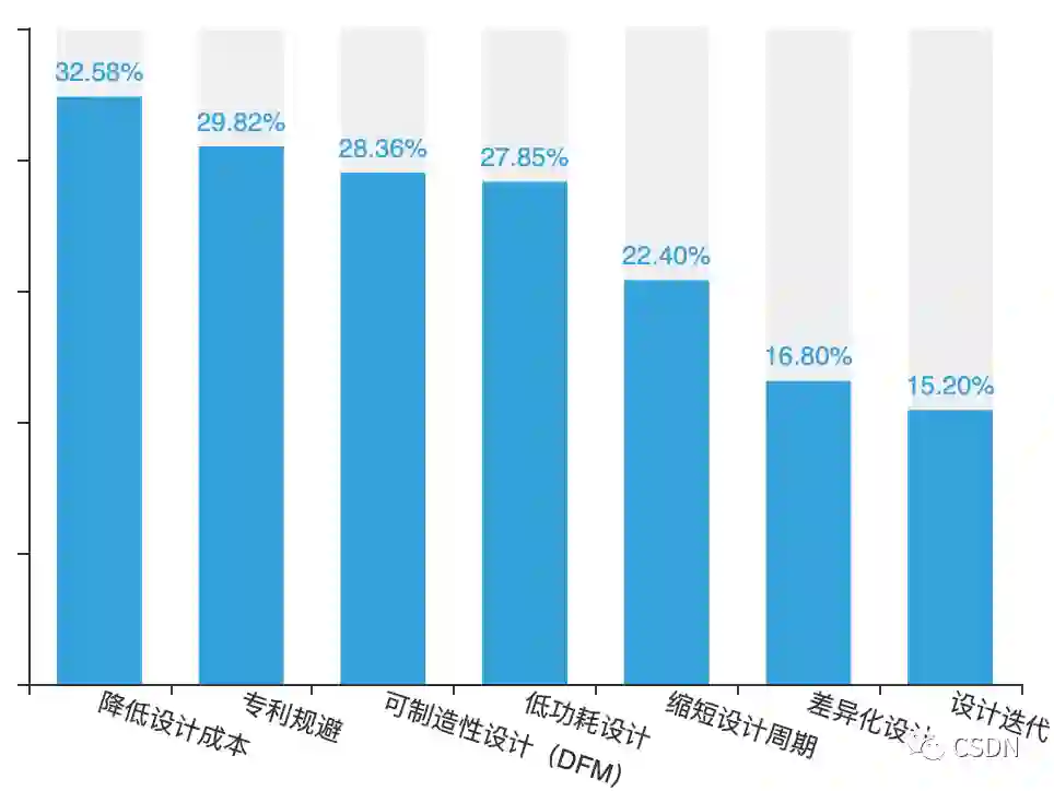 32.58%的开发者认为,国产芯片开发过程中,首要需要解决的问题是降低设计成本。其次是专利规避问题,占比29.82%,另有28.36%和27.85%开发者分别认为可制造性设计、低功耗设计也是不容小觑的问题。
