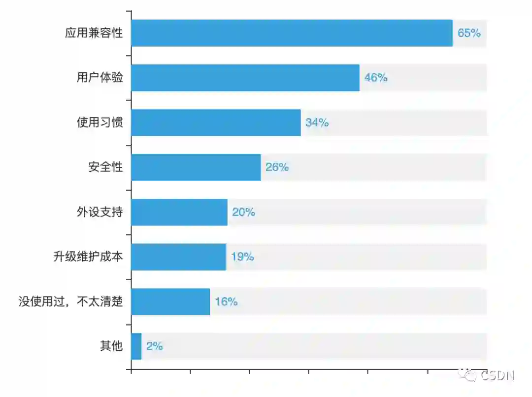 即使国产操作系统发展迅速,也不敌老牌操作系统Linux的市场存量,其作为服务端主要操作系统,面向用户侧并没有很好的软件生态,却有74%的开发者仍然愿意继续使用。