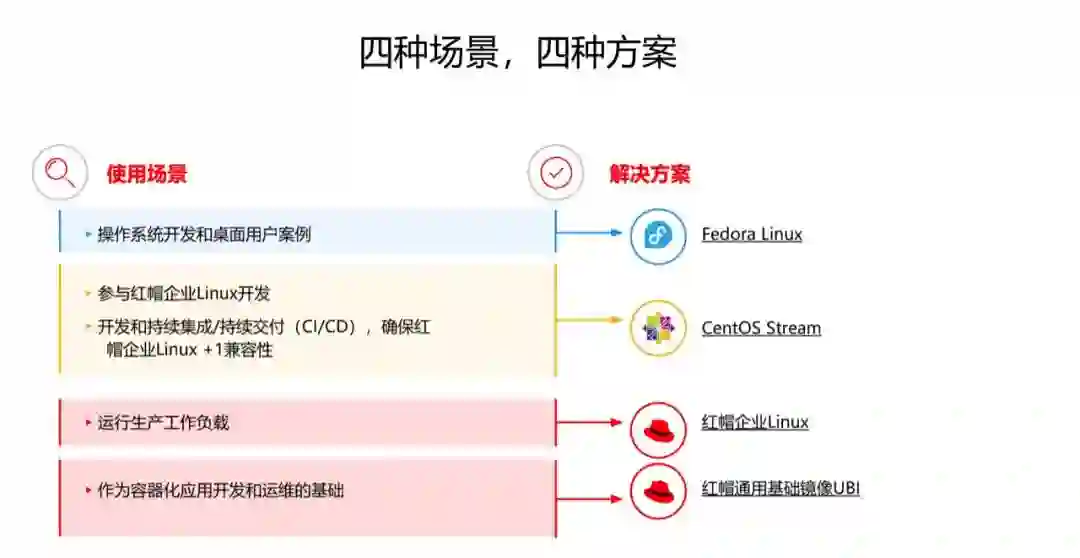 因此,自 2014 年开始,红帽企业级 Linux 生态系统形成了 Fedora、RHEL 和 CentOS Linux 协同发展的局面,社区上游通过 Fedora 向广大开发工程师提供桌面操作系统的持续创新和技术架构整合,大约是每 6 个月发布一个版本;中游是红帽企业级 Linux,主要面向广大企业和应用开发商,特点是稳定、安全和性能优化;下游是社区领导的 CentOS Linux,面向成本敏感用户和生态开发者,特点是无成本、易获取,大约在红帽企业 Linux 发布的几个月后发布。