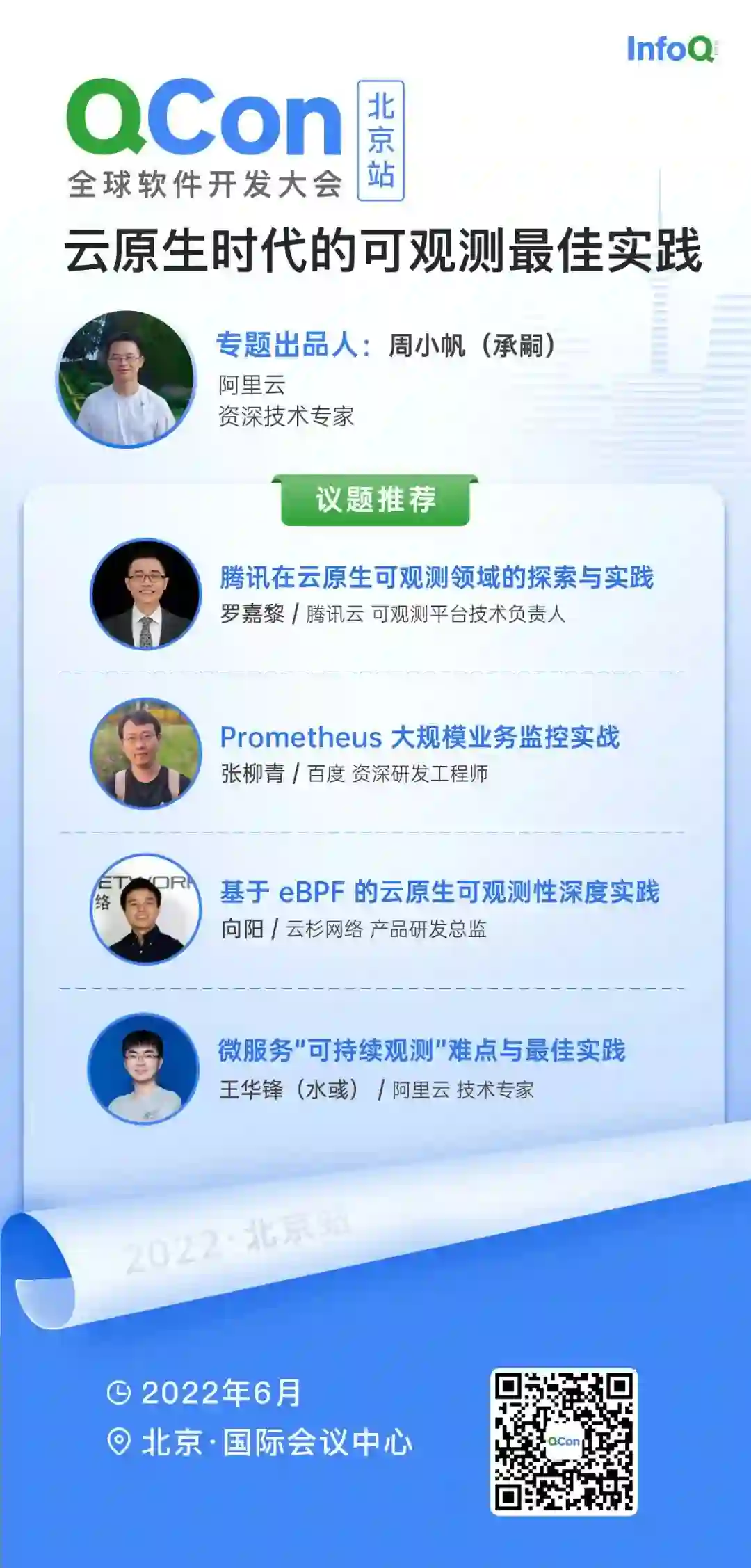 2022 年 6 月,QCon 全球软件开发大会北京站策划【云原生时代的可观测最佳实践】专场,邀请阿里云资深技术专家担任出品人,议题已上线官网,演讲提纲可点击底部【阅读原文】查看。