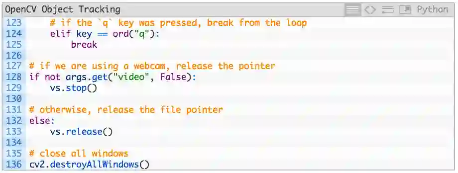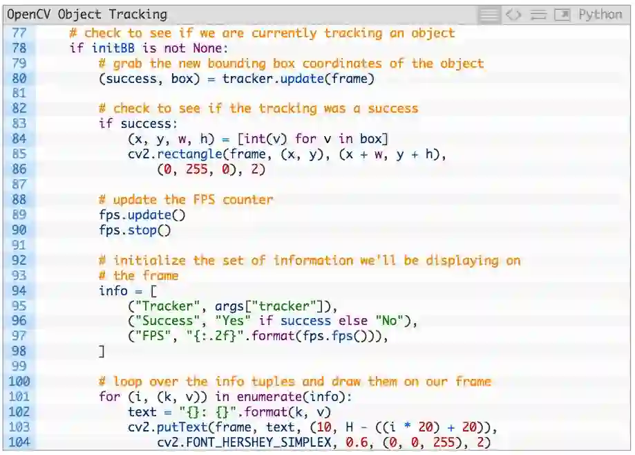 对于3.3以上的版本,每个追踪器可以用各自的函数创造,如cv2. TrackerKCF_create。词典OPENCV_OBJECT_TRACKERS包含了7种OpenCV的目标追踪器(30—38行)。它将目标追踪器的命令行参数字符串映射到实际的OpenCV追踪器函数上。