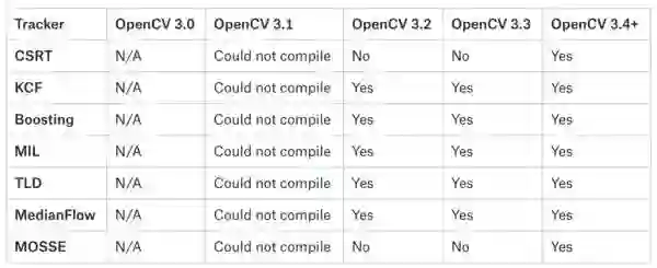 从OpenCV 3开始,目标检测器得到了快速发展,下表总结了不同版本的OpenCV中可食用的追踪器: