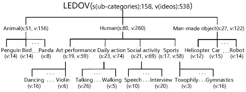 为了保证视频内容的丰富性,我们粗糙构造了基于视频内容关键字的动态树,并基于此在 Youtube 上下载视频,并基于实际情况修改动态树。最终动态树结构见图 3,共计 158 个视频子类,538 个视频片段(部分实例见图 4)。