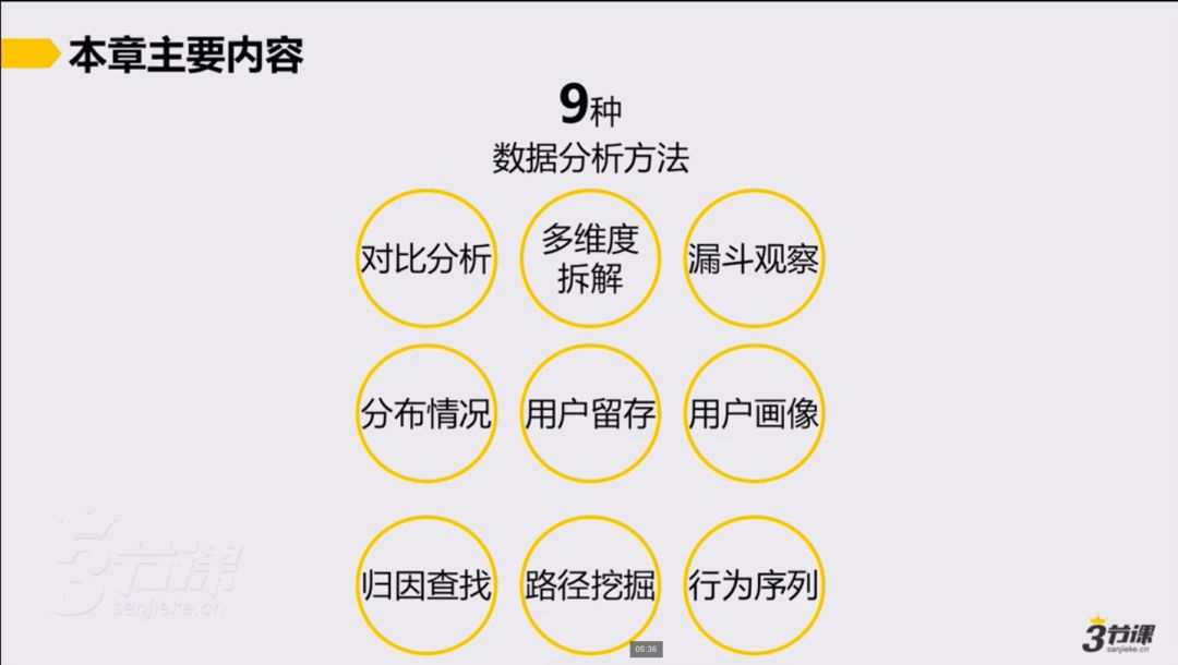 比如,面对大家「不知道怎么分析数据」「拿到数据不知如何下手」等情况,课程中会带给大家 9 种常见的数据分析方法,更重要的是,告诉你在什么情况下使用什么方法才有效: