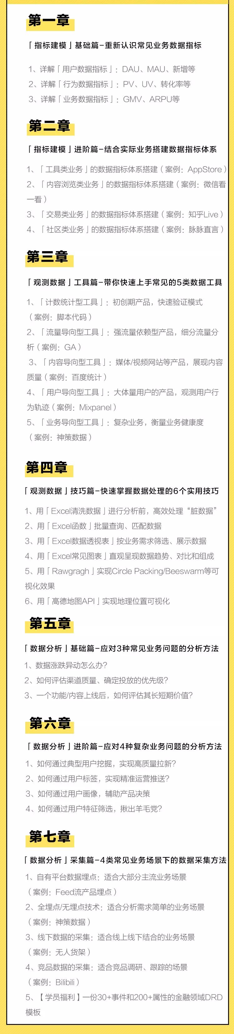 第三,这门课程不会教你编程、也不会教你代码!只会在100+个实战案例中,训练产品、运营、市场等业务同学常见场景的数据分析思路,帮大家了解数据分析语境下的核心定义、工具、方法,弥补你面对数据“毫无分析思路”的“硬伤”!