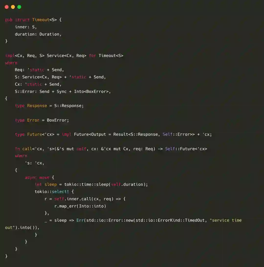 由于使用了 Rust 的 GAT 特性,因此我们可以解决返回异步 Future 带来的生命周期问题。同时,如果配合 type_alias_impl_trait 使用,效果更佳,比如实现 Timeout 可以使用如下方式: