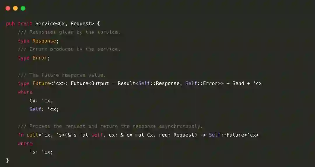 受益于 Rust 强大的表达和抽象能力,通过灵活的中间件 Service 抽象,开发者可以以非常统一的形式,对 RPC 元信息、请求和响应做处理。