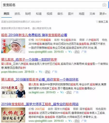我们商量尝试提高投放范围,增加几个省份,每天竞价费用多了不少,而没有太明显的提升,买了一些代理服务,挂手机上查看不同地方的竞价广告,发现就是那个生成姓名的宝宝起名服务占据了半壁江山,
