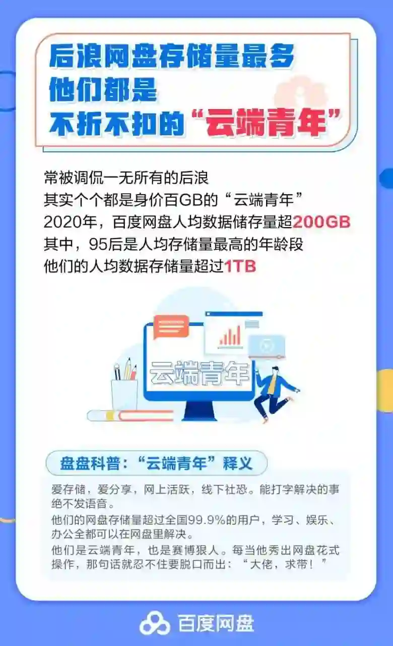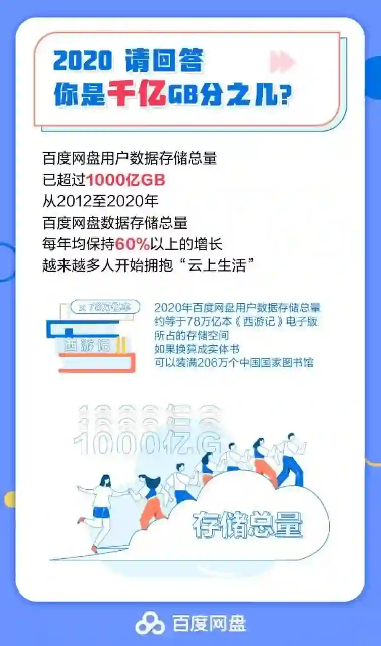 2020 年百度网盘用户数据存储总量已突破 1000 亿GB,用户数量破 7 亿,自 2012 年正式运营起每年均保持60%以上的增长,用户人均数据存储量超过 200 GB,而95后人均数据存储量达到了 2TB 之多。