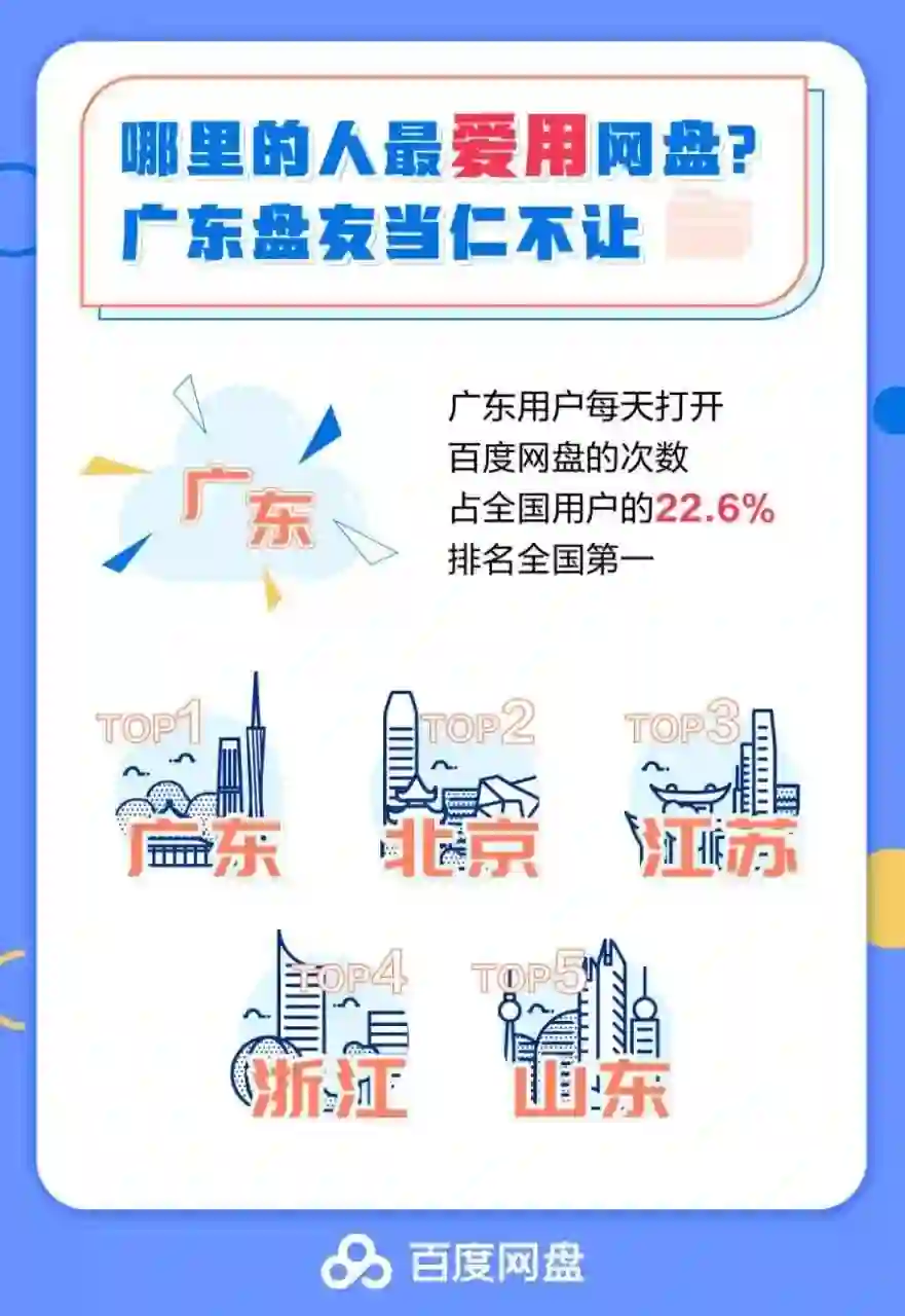在使用地区方面,广东用户每天打开百度网盘的次数占全国用户的 22.6%,排名第一;而北京、江苏、浙江和山东则位列其后。