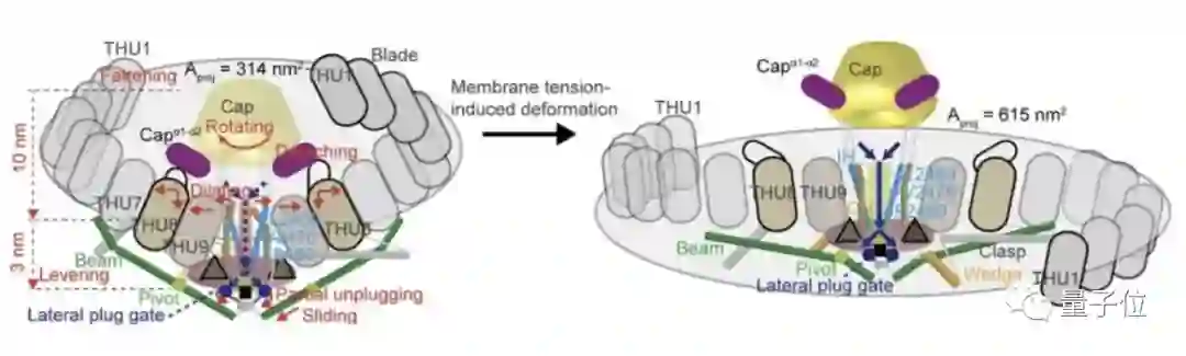 在静息状态时,该蛋白处于平衡状态(碗表面积为628nm2、投影面积为314nm2);膜张力改变时,平衡被打破,膜带动着PIEZO1蛋白一起展平。