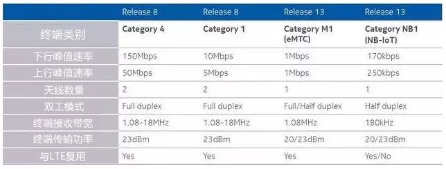早在2008年,LTE的第一个版本R8(Release 8)中,除了有满足宽带多媒体应用的Cat.3、Cat.4、Cat.5等终端等级外,也有上行峰值速率仅有5Mbit/s的终端等级Cat.1,可用于物联网等“低速率”应用。