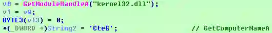 后门程序没有使用系统函数GetProcAddress获取API地址,在获取了对应DLL基址后,会采用了自己遍历导出表的方式寻找导出函数地址,比如收集本机信息功能: