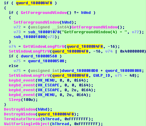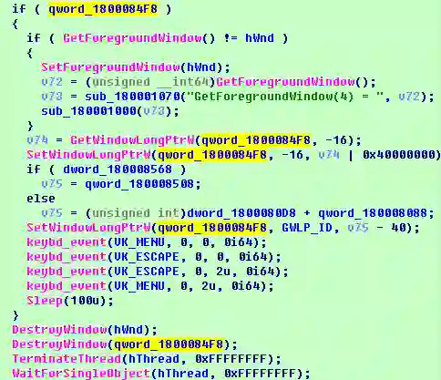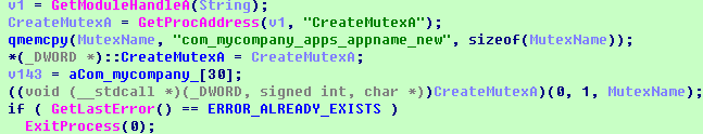 后门程序在启动时隐藏了自身窗口,创建了名为 com_mycompany_apps_appname_new 的互斥体,如果存在该互斥体,则退出程序,防止重复运行。