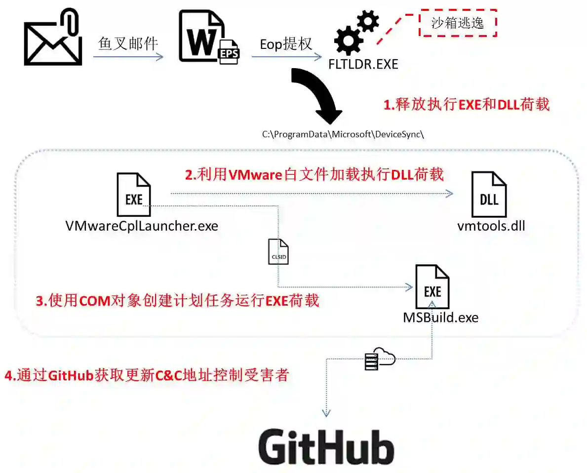 此次攻击的样本使用了内核提权漏洞进行沙箱逃逸、白利用执行DLL荷载、COM对象创建计划任务、Github公共资源更新C&C等技术,主要攻击流程如下图所示: