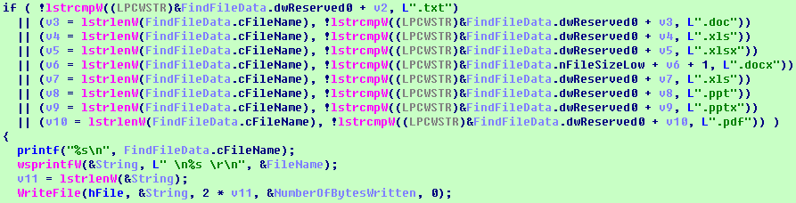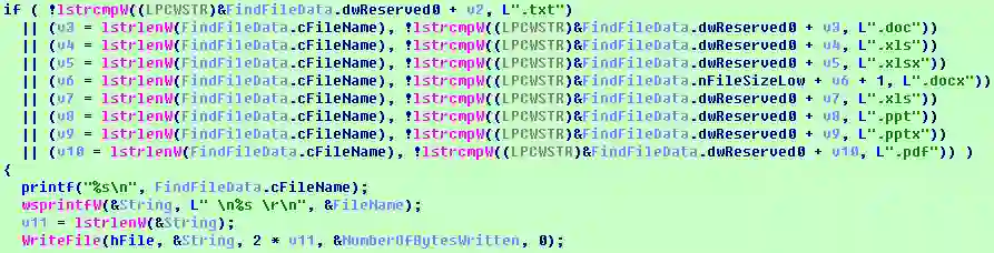 后门程序会截取电脑中的机密文档,通过递归遍历本地磁盘,将其中符合下述后缀的文件名