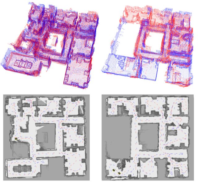 在本文的现场实验中,分布式轨迹估计算法可以通过两种机器人(红,蓝)对整个建筑物进行3D重建。上面图形显示的是一个楼层的重建点云,并将估计的轨迹叠加在一个占用栅格图上(下面)。