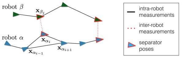作者给出了一个双机器人协作轨迹估计的实例:两个机器人(α蓝色,深绿色β)穿过未知的环境,机器人收集各自的探测信息(黑色实线)。作者定义为intra-robot measurements,包括里程计测量结果,回环检测等。而在交互点时,机器人可以观测到相互之间的位置信息(红色虚线),比如xαi,xβj 。(在这里作者使用一个专业术语separators,定义在机器人间测量得到的位姿信息)。目的是通过两个机器人计算其轨迹的最大似然(ML)估计。