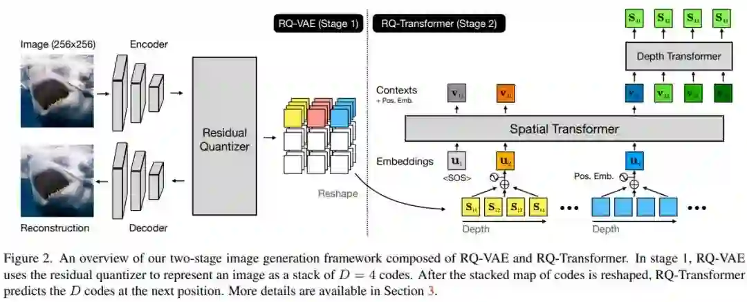 研究者提出了用于图像 AR 建模的 RQ-VAE 和 RQ-Transformer 两阶段框架,如下图 2 所示。RQ-VAE 使用编码簿将图像表示为 D 个离散码的堆叠图。然后,使用 RQ-Transformer 自回归预测下一个空间位置的下一个 D 码。他们还解释了使用 RQ-Transformer 解决 AR 模型训练中的曝光偏差问题。