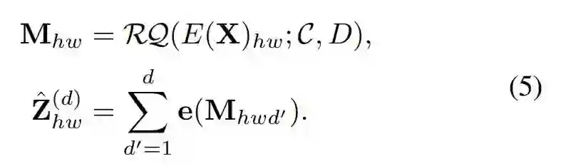 具体而言,深度为 D 的 RQ-VAE 将特征图 Z 表示为代码 M ϵ [K]^H×W×D 的堆叠图,并提取了 ,成为 d ϵ [D]的深度为 D 的量化特征图,得到如下公式(5)。