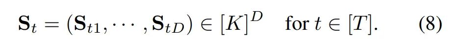 深度为 D 的代码的 AR 建模。在 RQ-VAE 提取代码映射 M ϵ ^[K] H×W×D 后,光栅扫描顺序(raster scan order)将 M 的空间索引重新排列为代码 S ϵ [ K]^T ×D 的二维数组,其中 T = HW。也就是说,S_t 是 S 的第 t 行,并包含了 D 个代码,如下公式(8)所示。