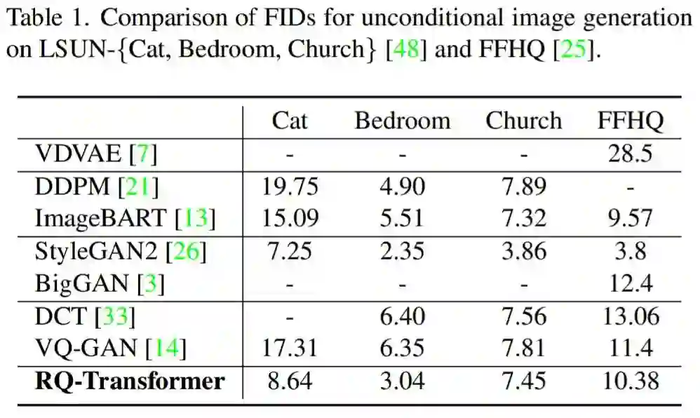 该研究在 LSUN-{cat, bedroom, church}和 FFHQ 数据集上评估了无条件图像生成的质量。表 1 显示,RQ-Transformer 模型在无条件生成图像方面优于其他 AR 模型。对于小规模数据集,如 LSUN-church 和 FFHQ,RQ-Transformer 小幅度优于 DCT 和 VQ-GAN。对于更大规模的数据集,如 LSUN-{cat, bedroom},RQ-Transformer 明显优于其他 AR 模型和基于扩散的模型。