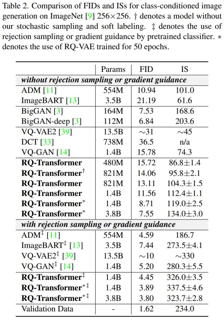 该研究分别使用 ImageNet 和 CC-3M 进行类和文本条件的图像生成。如表 2 所示,RQ-Transformer 在 ImageNet 上的性能明显优于以前的模型。RQ-Transformer(480M 参数)与以往 AR 模型具有竞争力,包括 VQ-VAE2, DCT,和 VQ-GAN,虽然 RQ-Transformer 比 VQ-GAN 少 3 倍的参数。此外,具有 821M 参数的 RQ-Transformer 在没有拒绝采样的情况下优于以往的 AR 模型。