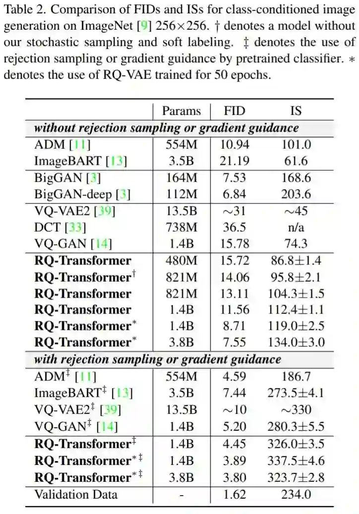 具有 1.4B 参数的 RQ-Transformer 在没有拒绝采样的情况下达到 11.56 的 FID 分数。当将 RQ-VAE 的训练 epoch 从 10 增加到 50 时,1.4B 参数的 RQ-Transformer 进一步提高了性能,达到了 8.71 FID 分数 。此外,当研究者进一步将参数数量增加到 3.8B 时,RQ-Transformer 在没有拒绝采样的情况下达到了 7.55 的 FID 分数,并且可以与 BigGAN 竞争。