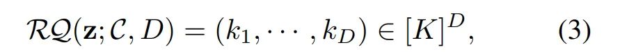 对于残差量化,研究者没有增加编码簿大小,而是采用残差量化(RQ)来离散化向量 z。给定一个量化深度 D,RQ 将 z 表示为一个有序的 D 码,如下公式(3)所示。