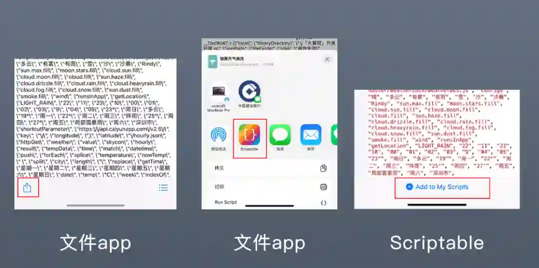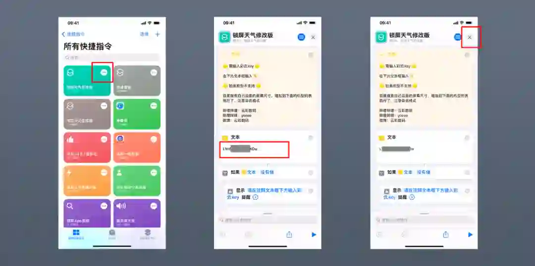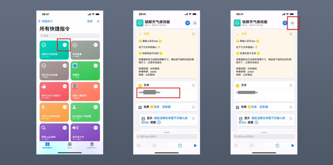 打开快捷指令 app,找到刚刚导入的快捷指令,在下图的这个文本框填写彩云天气 key,没有的话去申请一个(每个号每天免费 1000 次数据请求),填写完右上角关闭这个快捷指令。